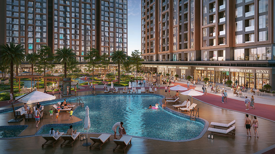 - Tiện ích ngoài trời: bể bơi ngoài trời, hệ thống sân thể thao tiêu chuẩn Olympic, sân chơi trẻ em, khu tập Gym ngoài trời, thảm cỏ, đường dạo, ghế nghỉ, hệ thống shop chân đế, …