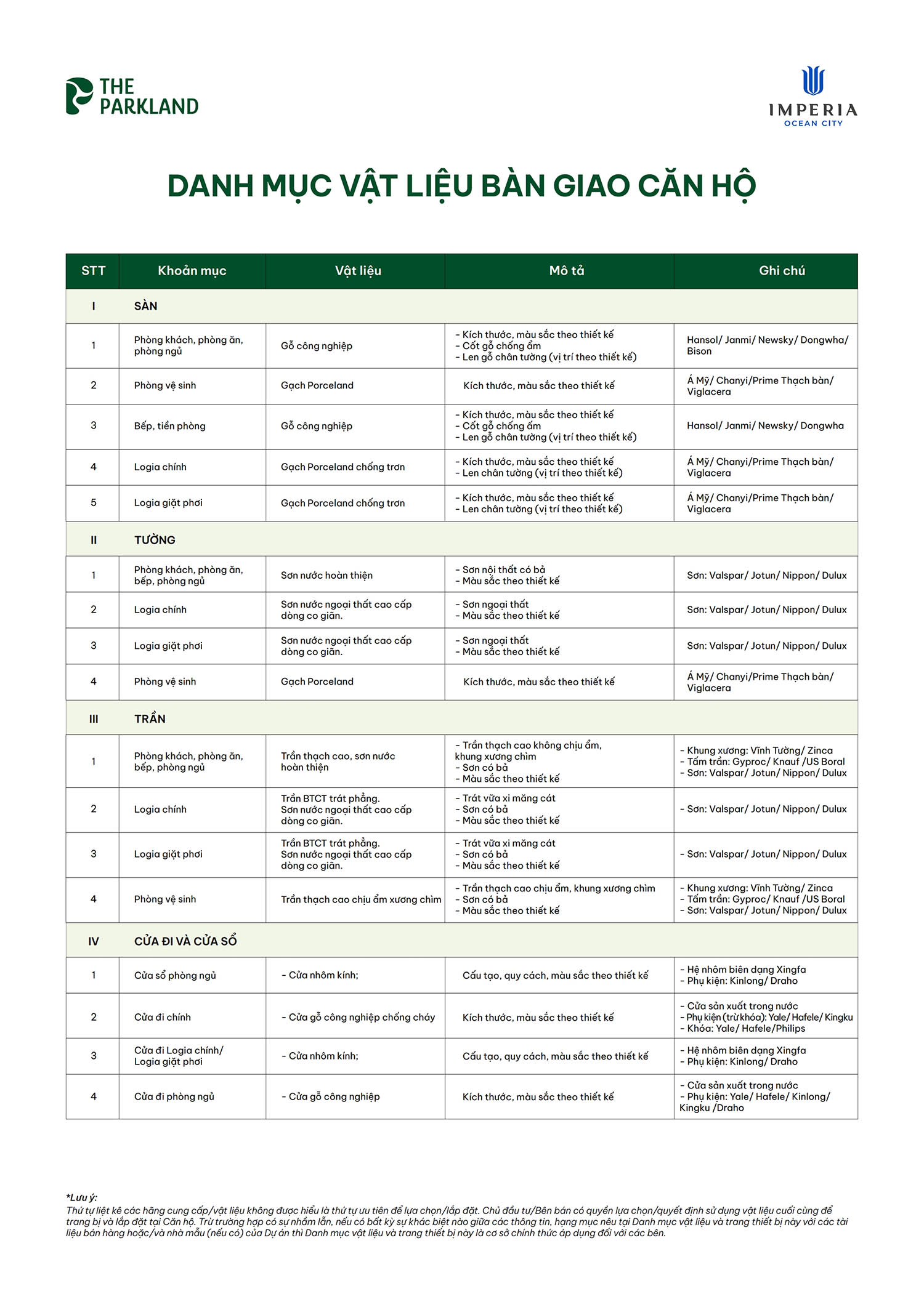 Tiêu chuẩn bàn giao nội thất căn hộ The Parkland Imperia Ocean City